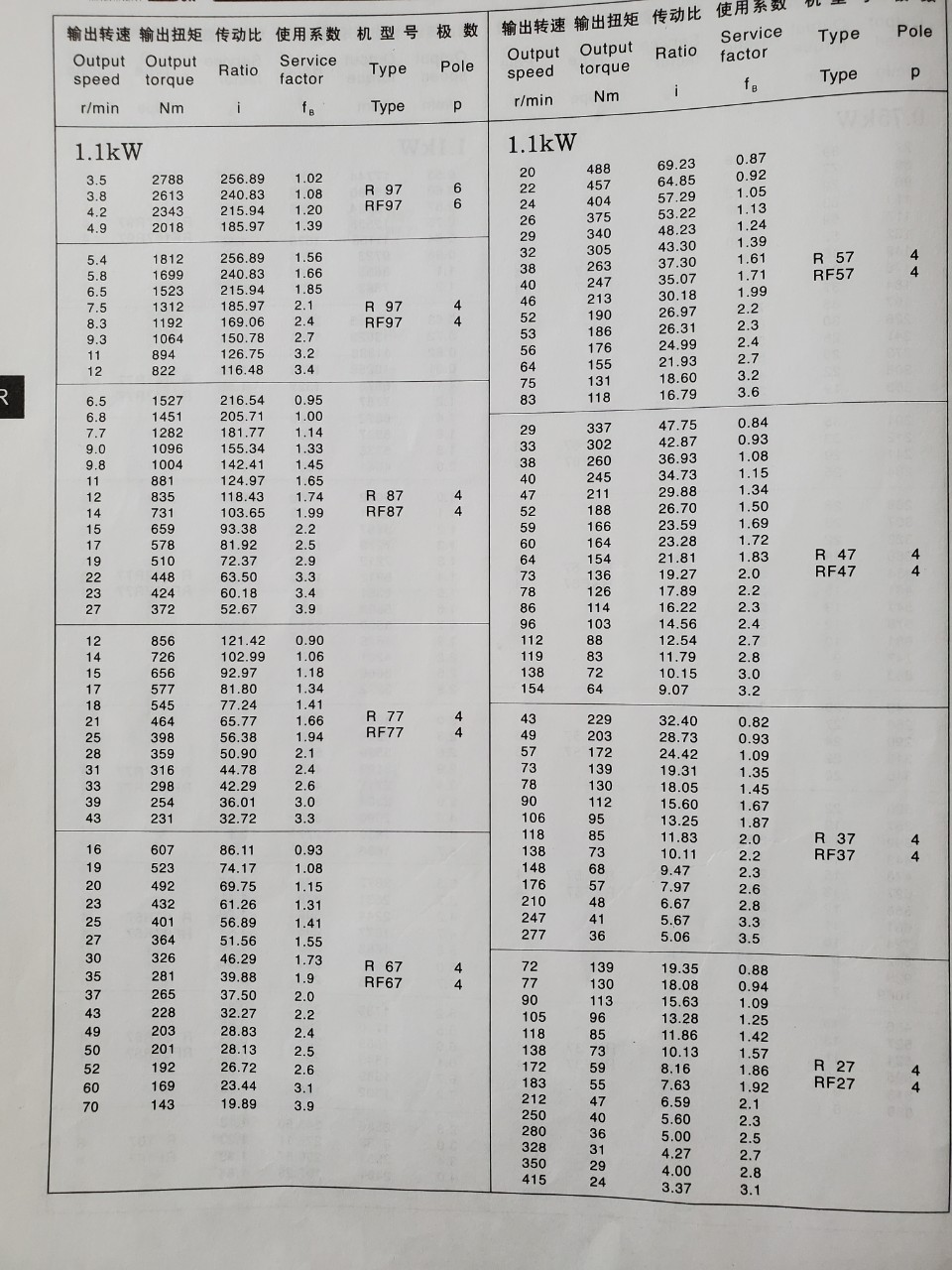 Tốc độ motor giảm tốc 1.5HP 1.1kw tải nặng còn có các ratio sau: 57.68, 60.35, 61.26. Tốc độ trục ra trong khoảng 20 tới 30 vòng / 1 phút.