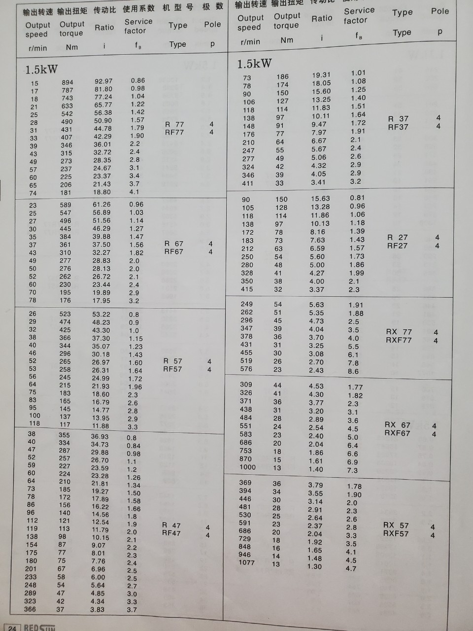 Tốc độ: Motor giảm tốc 1.5kw 1/5, ratio i = 5, nghĩa là tốc độ motor điện ở trục ra giảm đi 5 lần. Motor tốc độ 1400 / 5 = 280 hoặc 1500 / 5 = 300. Tốc độ trục ra khoảng 280 - 300 vòng / 1 phút