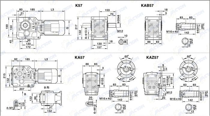 Hộp giảm tốc bánh răng côn K57 thuộc dòng Bevel Gear Reducer sử dụng hệ bánh răng côn giao nhau giúp thay đổi hướng truyền động (thường 90 độ), đồng thời giảm tốc độ motor và tăng mô-men xoắn.