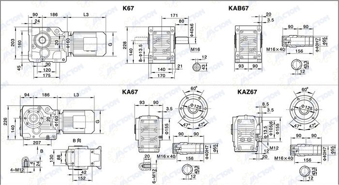 Hộp giảm tốc K67 là dòng giảm tốc bánh răng côn kết hợp bánh răng trụ, với kết cấu chắc chắn, cho phép truyền lực mạnh mẽ và hoạt động ổn định trong thời gian dài.
