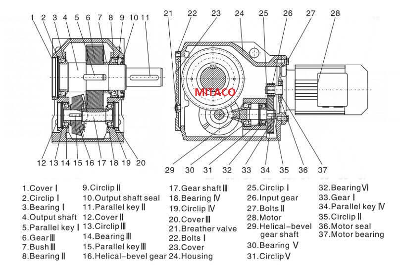 Một hộp giảm tốc trục vuông góc tiêu chuẩn gồm: