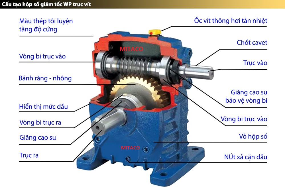 Vỏ bằng gang, trục vít bằng thép, bánh vít bằng đồng.