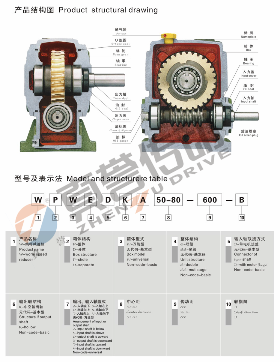 Vỏ bằng gang, trục vít bằng thép, bánh vít bằng đồng.