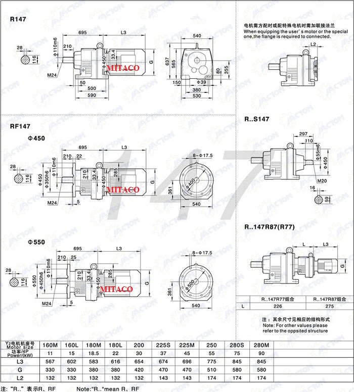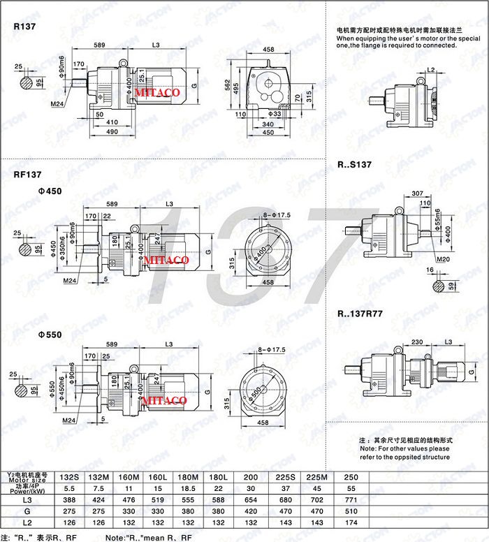 Các size từ RF 17 đến RF 167 phù hợp lắp motor công suất từ 0.12kW đến 200kW
